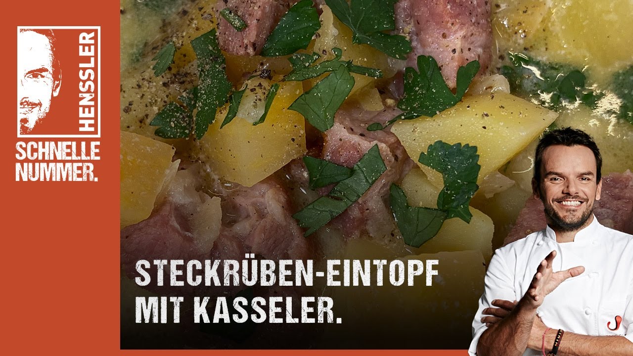 . Steckrübeneintopf mit Kasseler Die Zutaten Für 4 Personen Blättchen von 1 Bund Petersilie 1 Zwiebel 40 g Rapsöl 200 g Kasselerkamm ohne Knochen in Würfeln 250 g. Mehr schnelle Gerichte und Rezepte mit Video-Anleitunge. Das schnelle Steckrüben-Eintopf mit Kasseler Rezept vom Henssler - Schnell und einfach selbst kochen.
